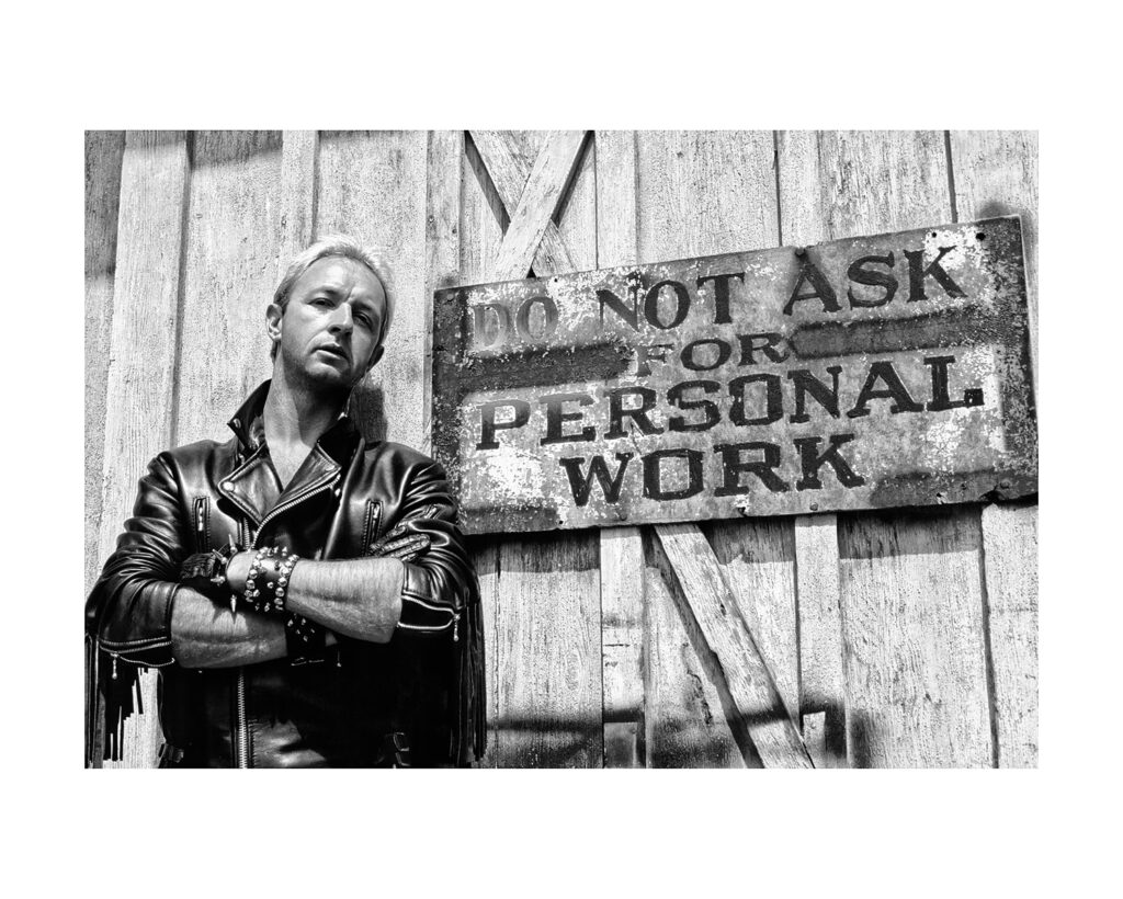 May 1985, Hear โn Aid recording on Stars at A&M studios in Hollywood. Hear โn Aid was a heavy metal charity record organized by Dio. I sat outside chatting with Rob in the courtyard where there was this big warning sign behind us that โcalledโ for photos. He obliged without a problem.
